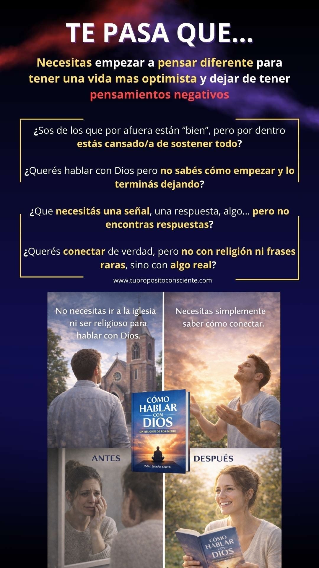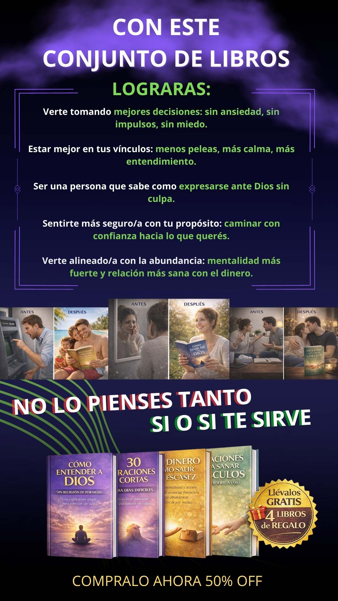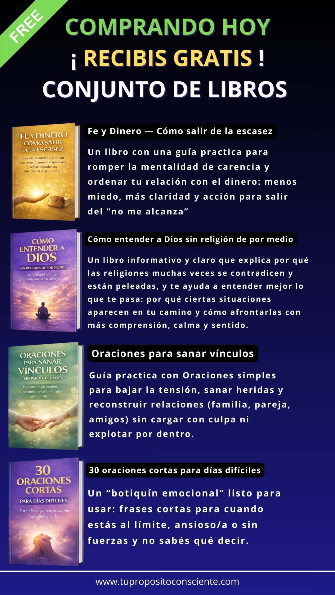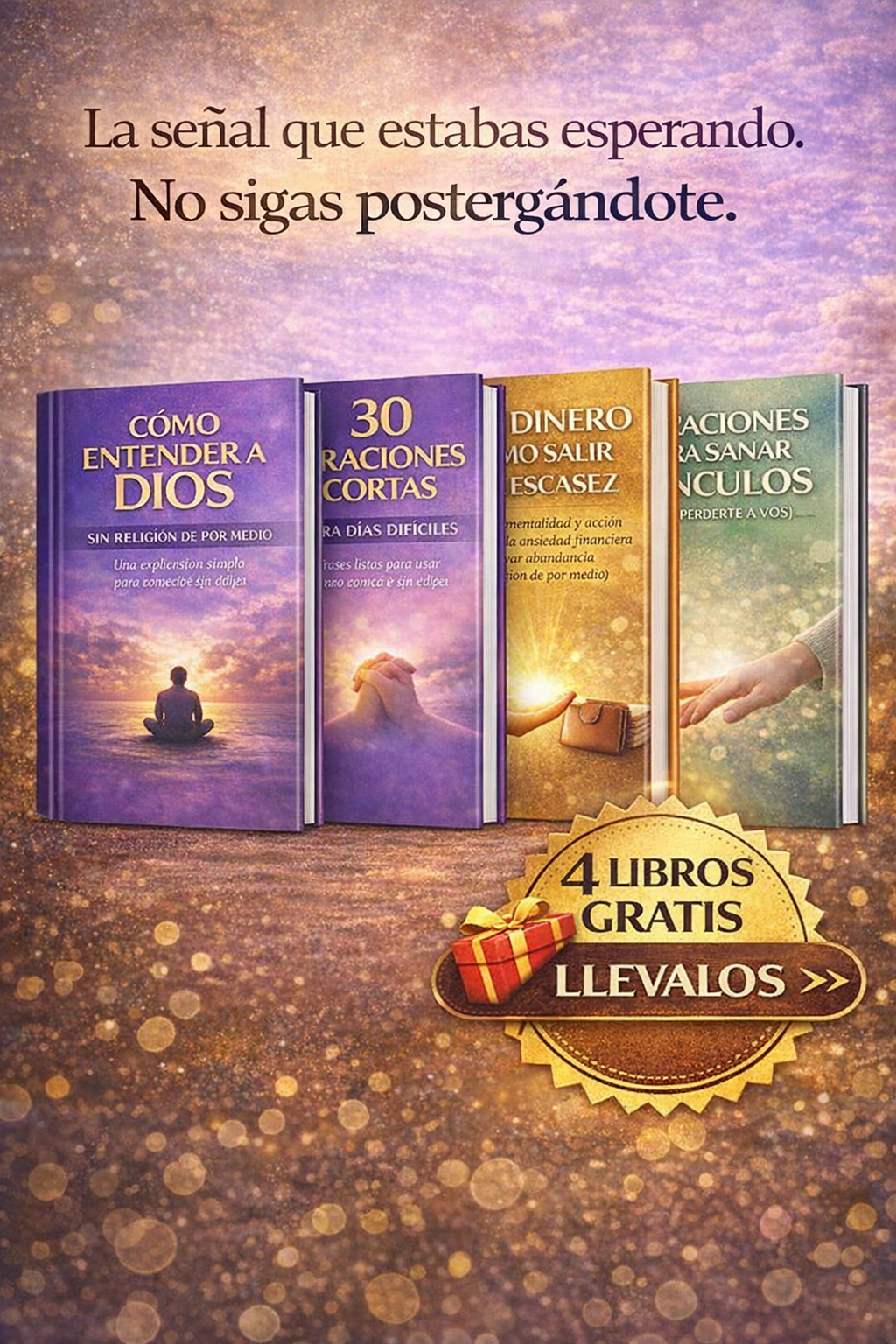 Vas a recibir el e-book “Cómo hablar con Dios — sin religión de por medio” en formato digital y además 4 libros de regalo con contenidos complementarios sobre vínculos, dinero, oraciones para días difíciles y comprensión espiritual.